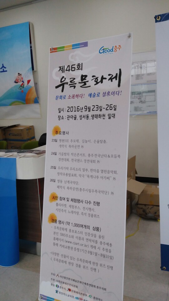 제 46회 우륵문화제 사전홍보 작성자 위드다임 등록일자 2020년 9월 9일 11시 16분 14초 조회 219 2016년 7월 30일 충주 호수축제가 열리는 탄금호 국제조정경기장에서 제 46회 우륵문화제를 알리기 위한 사전홍보가 진행되었습니다.많은 시민분들에게 제 46회우륵문화제에 대해 많은 관심을 보여주셨습니다. 46_사전홍보1.jpg [ Size : 73.21KB, Down : 258 ] 미리보기 다운로드 46_사전홍보2.jpg [ Size : 119.2KB, Down : 257 ] 미리보기 다운로드 46_사전홍보3.jpg [ Size : 87.22KB, Down : 261 ] 미리보기 다운로드 46_사전홍보4.jpg [ Size : 74.11KB, Down : 257 ] 미리보기 다운로드 46_사전홍보5.jpg [ Size : 98.41KB, Down : 255 ] 미리보기 다운로드 목록보기