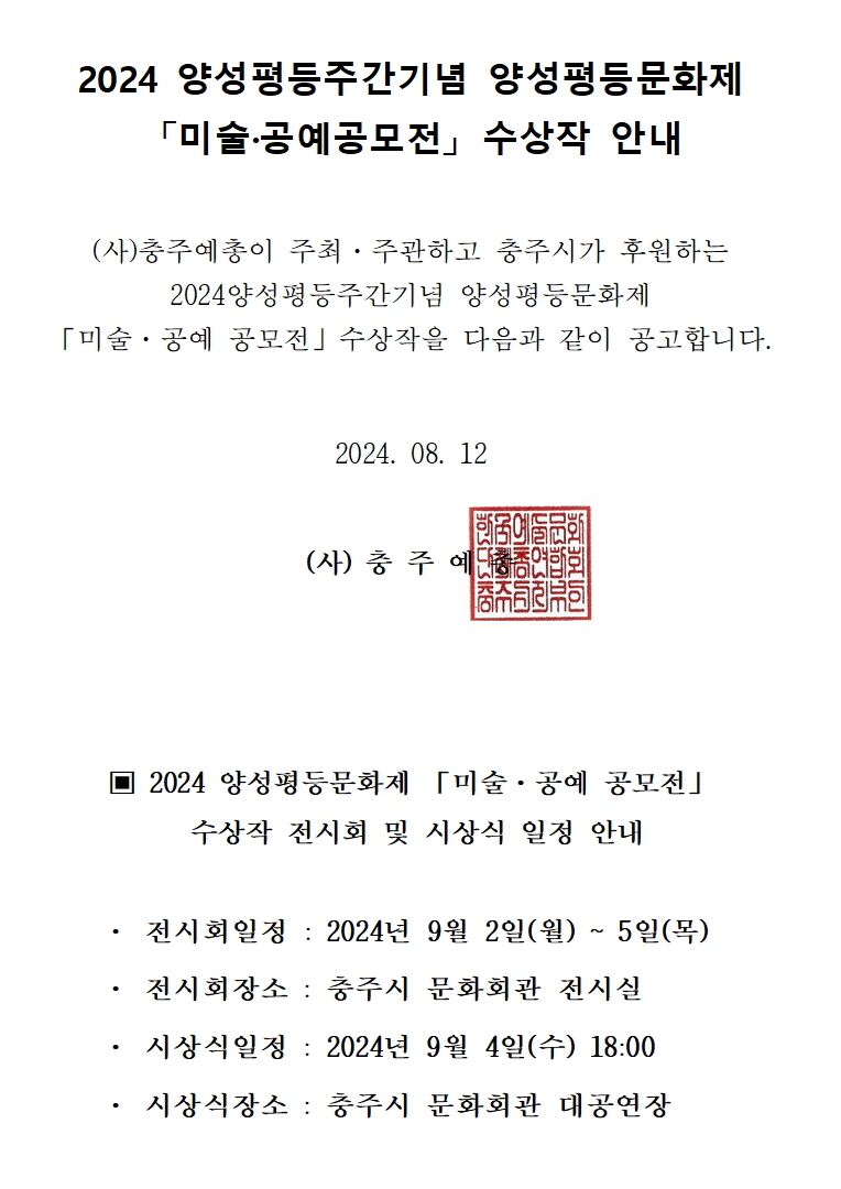 2024양성평등문화제 미술,공예공모전 수상작 안내 작성자 운영자 등록일자 2024년 8월 12일 11시 51분 41초 조회 400 2024 양성평등문화제 '미술,공예공모전' 수상작 명단을 아래의 첨부파일과 같이 공고합니다. 2024 양성평등문화제 미술공예공모전 당선작.pdf [ Size : 62.96KB, Down : 688 ] 다운로드 공고문1.jpg [ Size : 245.12KB, Down : 450 ] 미리보기 다운로드 목록보기