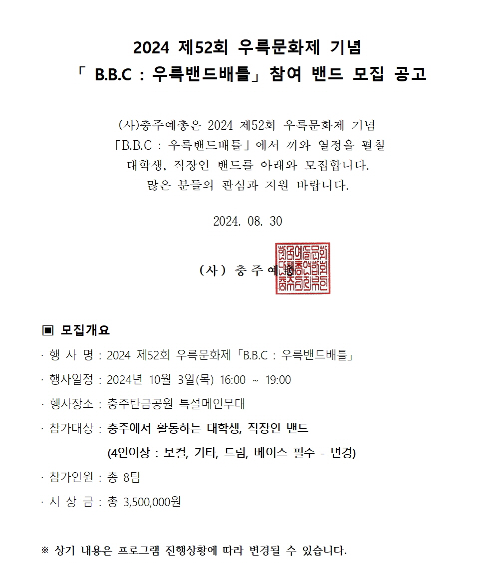 제52회 우륵문화제 기념' B.B.C:우륵밴드배틀' 참여밴드 모집 공고(내용변경) 작성자 운영자 등록일자 2024년 8월 30일 17시 34분 21초 조회 438 ※ 자세한 공고내용 및 참가신청서류는 하단의 파일을 다운로드받아 확인해주시기 바랍니다. 제52회 우륵문화제 기념 B.B.C-우륵밴드배틀 참가신청서.hwp [ Size : 44KB, Down : 528 ] 다운로드 제52회 우륵문화제 기념 B.B.C-우륵밴드배틀 참가밴드 모집공고(수정).jpg [ Size : 313.46KB, Down : 445 ] 미리보기 다운로드 제52회 우륵문화제 기념 B.B.C-우륵밴드배틀 참가밴드 모집공고(내용수정).pdf [ Size : 108.96KB, Down : 614 ] 다운로드 목록보기