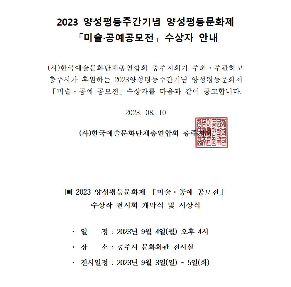 2023양성평등문화제 '미술,공예 공모전' 수상자 안내 작성자 운영자 등록일자 2023년 8월 10일 17시 13분 48초 조회 443 2023 양성평등문화제 '미술,공예공모전' 수상자 명단을 아래의 첨부파일과 같이 공고합니다. 수상자공고문001.jpg [ Size : 262.52KB, Down : 636 ] 미리보기 다운로드 2023 양성평등주간행사 미술.공예 공모전 당선작(최종-1).pdf [ Size : 42.53KB, Down : 627 ] 다운로드 목록보기