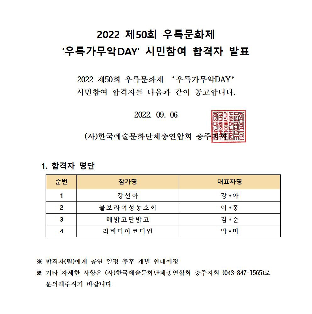 2022 제50회 우륵문화제 '우륵 가무악DAY' 시민참여 합격자 발표 작성자 운영자 등록일자 2022년 9월 6일 18시 39분 44초 조회 276 2022 제50회 우륵문화제 가무악DAY시민참여 합격자발표0.jpg [ Size : 224.38KB, Down : 366 ] 미리보기 다운로드 목록보기