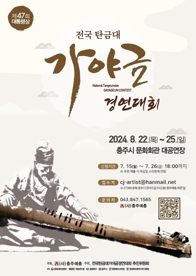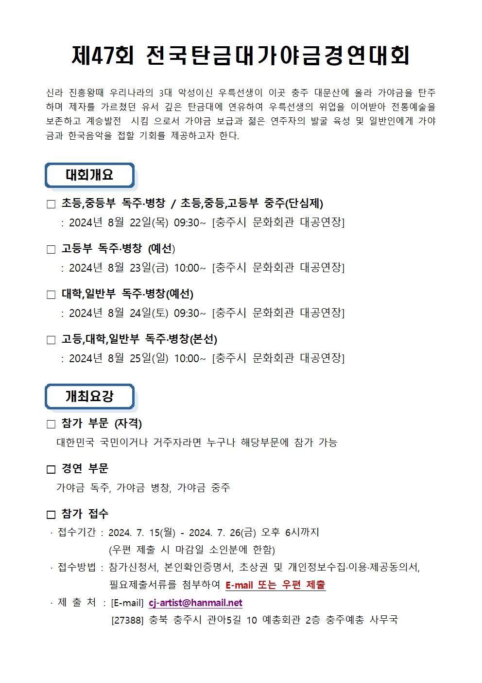 제47회 전국탄금대가야금경연대회 개최 안내 작성자 운영자 등록일자 2024년 5월 17일 16시 48분 23초 조회 1,754 ※ 자세한 계획서 및 참가신청서류는 하단의 파일을 다운로드받아 확인해주시기 바랍니다. 홈페이지 포스터대용001.jpg [ Size : 511.86KB, Down : 2,427 ] 미리보기 다운로드 제47회전국탄금대가야금경연대회 대회요강 - 홈페이지용.pdf [ Size : 248.23KB, Down : 2,151 ] 다운로드 제47회전국탄금대가야금경연대회 참가신청서 등.hwp [ Size : 3.1MB, Down : 1,272 ] 다운로드 가야금 경연대회 포스터_최종.JPG [ Size : 81.9KB, Down : 2,197 ] 미리보기 다운로드 목록보기