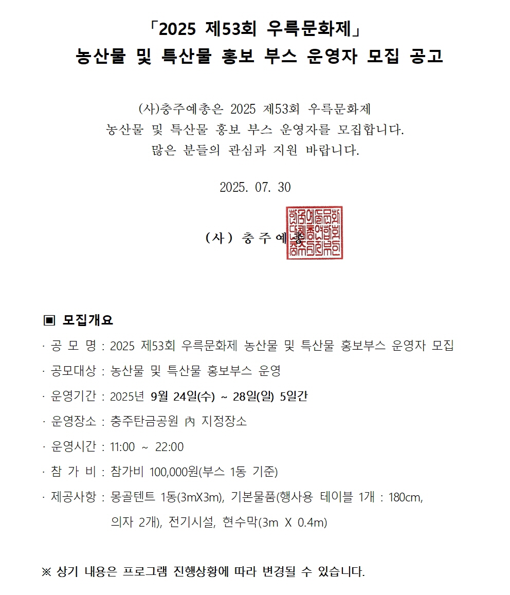 - 수정제53회 우륵문화제 농산물 및 특산물 홍보 부스 운영자 모집 공고문001.jpg [ Size : 327.03KB, Down : 134 ] 미리보기 다운로드