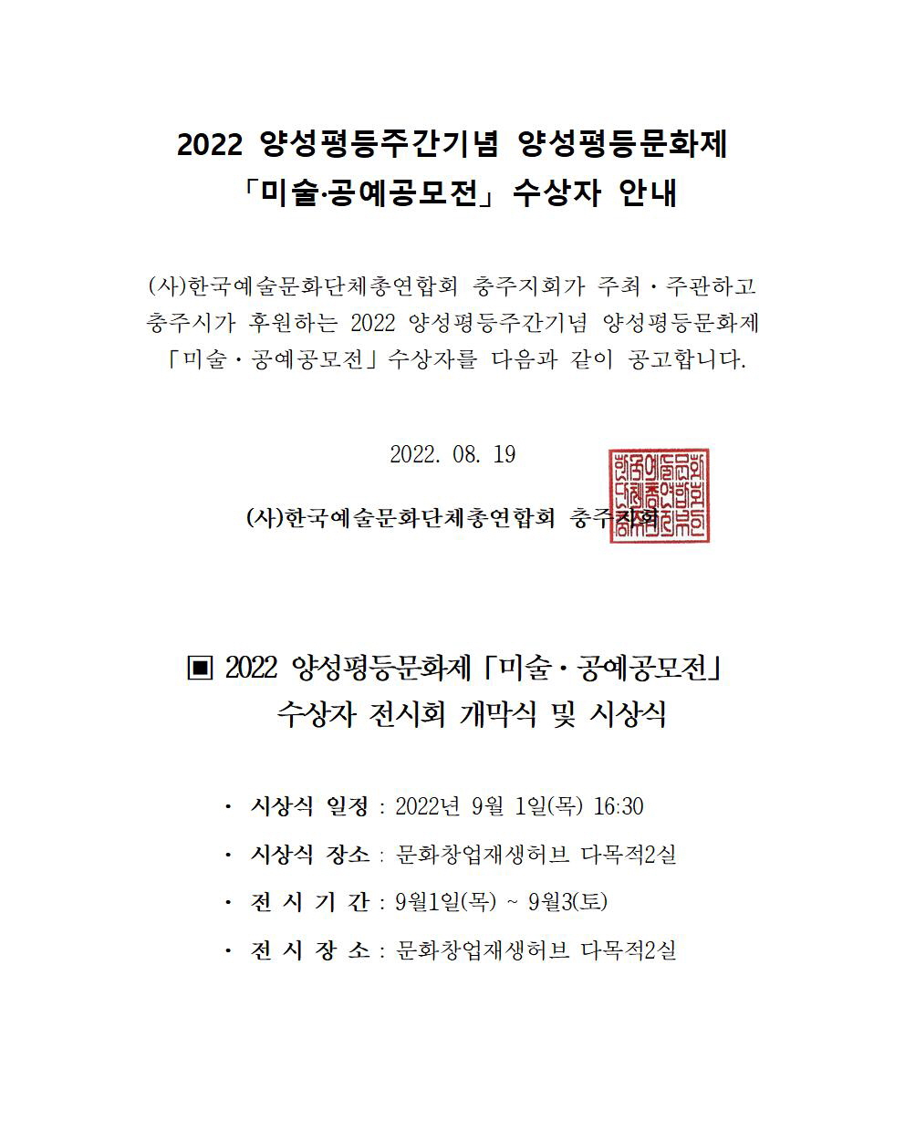 2022 양성평등문화제 '미술,공예공모전' 수상자, 시상식 및 전시회 일정 안내 작성자 운영자 등록일자 2022년 8월 19일 11시 0분 43초 조회 289 ※ 수상자 명단은 하단의 파일을 다운로드 받아 확인해주시기 바라며, 수상자께서는 시상식 일정을 확인하시어 당일 참석해 주시기 바랍니다. 공고문001 (2).jpg [ Size : 247.49KB, Down : 423 ] 미리보기 다운로드 2022 양성평등주간행사 미술.공예 공모전 당선작.pdf [ Size : 41.02KB, Down : 647 ] 다운로드 목록보기