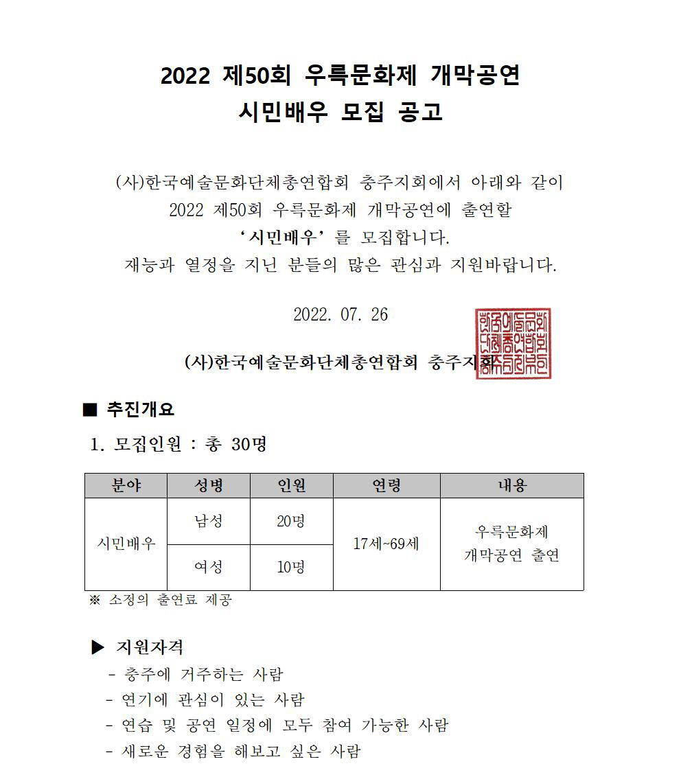 2022 제50회 우륵문화제 개막공연 '시민배우' 모집안내(기간연장)