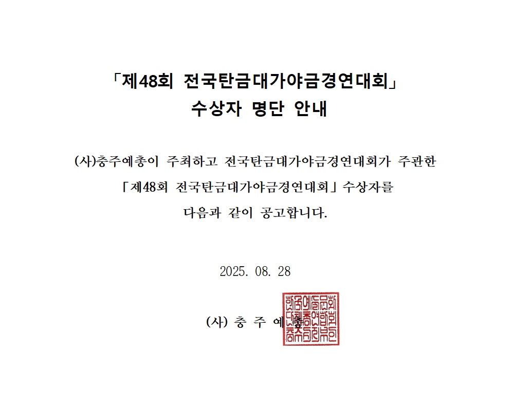 제48회 전국탄금대가야금경연대회 수상자 안내 작성자 운영자 등록일자 2025년 8월 28일 10시 25분 58초 조회 324 ※ 수상자명단은 하단의 파일을 다운로드 받아 확인해주시기 바랍니다. 제48회공고문001.jpg [ Size : 144.27KB, Down : 285 ] 미리보기 다운로드 수상자명단(제48회 전국탄금대가야금경연대회).pdf [ Size : 46.92KB, Down : 286 ] 다운로드 목록보기
