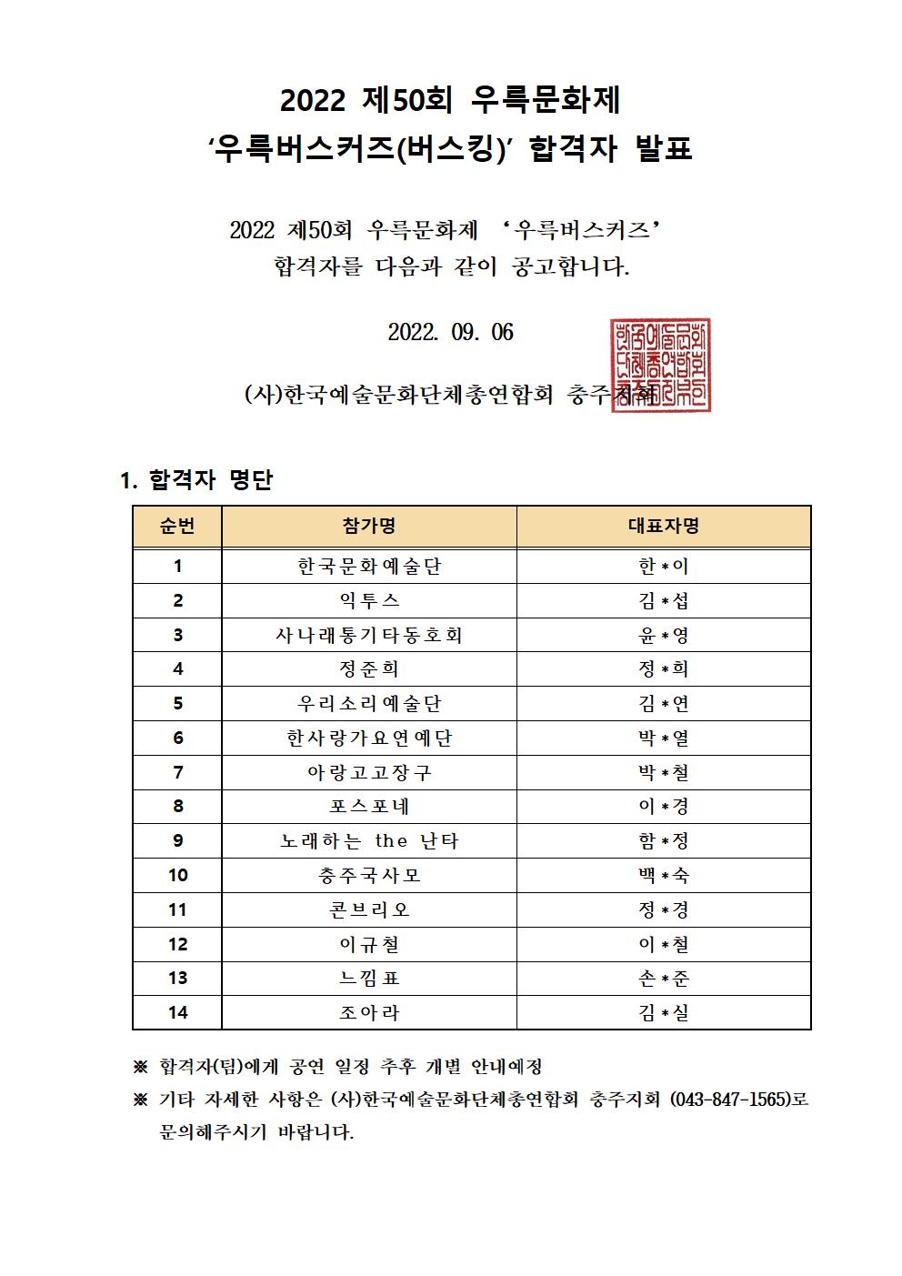 2022 제50회 우륵문화제 '우륵버스커즈(버스킹)' 합격자 발표 작성자 운영자 등록일자 2022년 9월 6일 18시 38분 59초 조회 333 2022 제50회 우륵문화제 우륵버스커즈 합격자발표001.jpg [ Size : 128.79KB, Down : 434 ] 미리보기 다운로드 목록보기