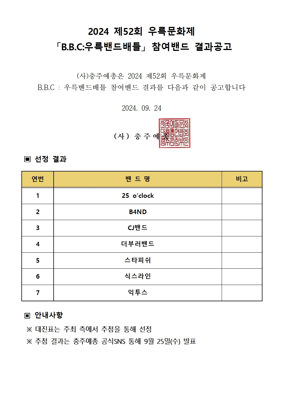 제52회 우륵문화제 'B.B.C :우륵밴드배틀' 참여밴드 결과 안내 작성자 운영자 등록일자 2024년 9월 24일 14시 34분 22초 조회 475 우륵밴드배틀 참여밴드 선정결과001.jpg [ Size : 274.16KB, Down : 521 ] 미리보기 다운로드 우륵밴드배틀 참여밴드 선정결과.pdf [ Size : 55.79KB, Down : 565 ] 다운로드 목록보기