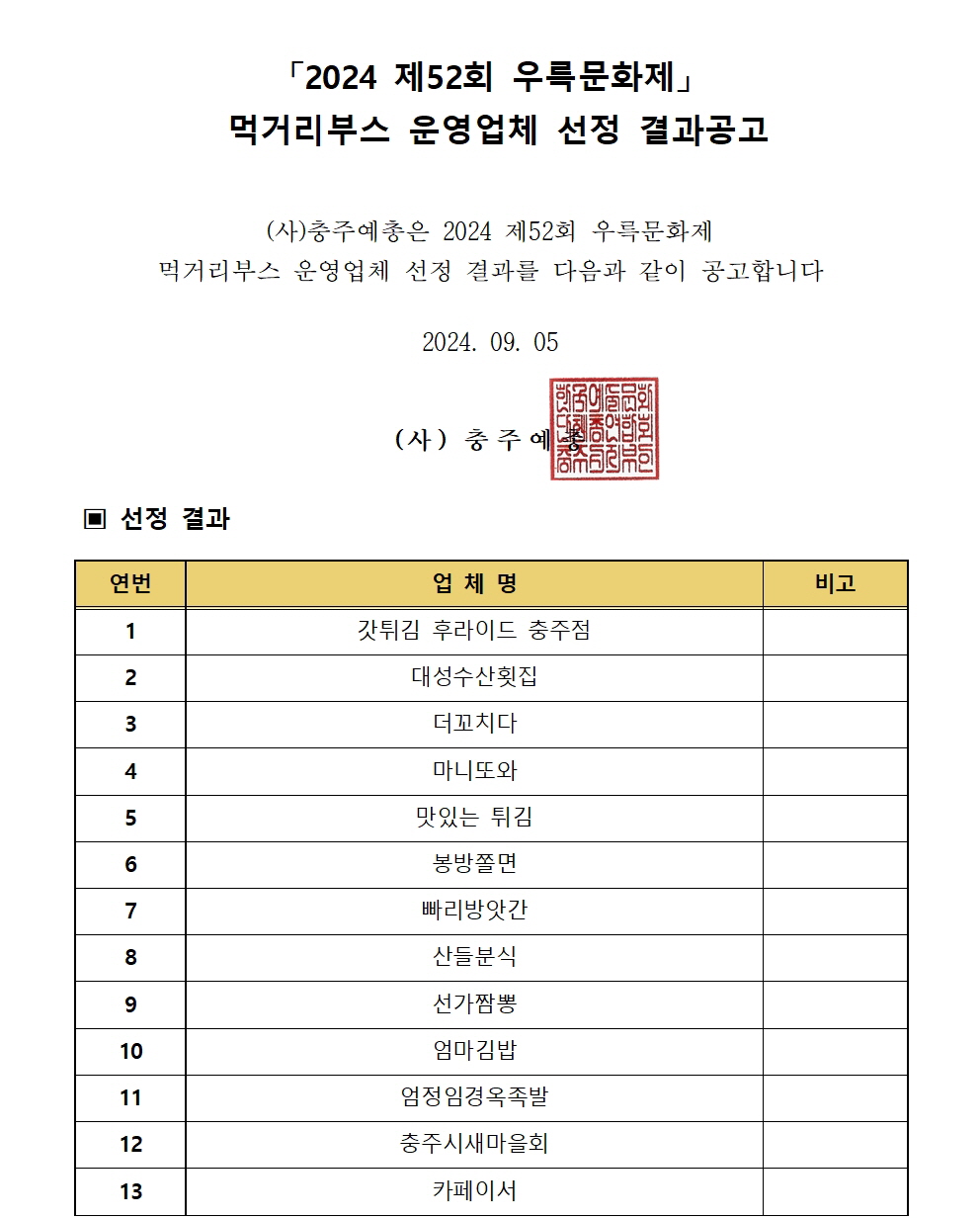 제52회 우륵문화제 먹거리부스 운영업체 선정결과 작성자 운영자 등록일자 2024년 9월 5일 15시 26분 54초 조회 497 홈페이지제52회 우륵문화제 먹거리부스 운영업체 선정결과001.jpg [ Size : 264.92KB, Down : 567 ] 미리보기 다운로드 홈페이지제52회 우륵문화제 먹거리부스 운영업체 선정결과002.jpg [ Size : 205.65KB, Down : 512 ] 미리보기 다운로드 제52회 우륵문화제 먹거리부스 운영업체 선정결과.pdf [ Size : 85.21KB, Down : 749 ] 다운로드 목록보기