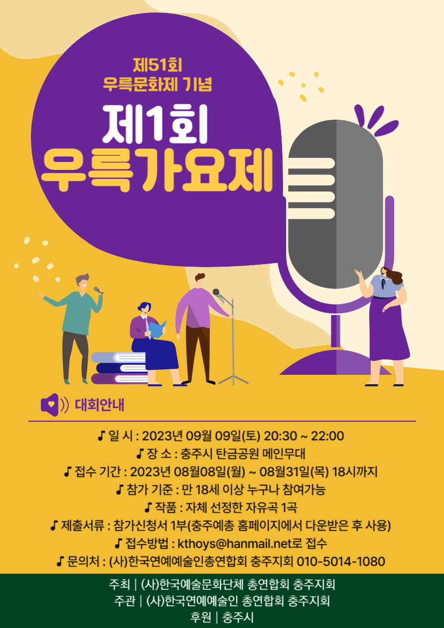 제51회 우륵문화제 기념 '제1회 우륵가요제' 개최 안내 작성자 운영자 등록일자 2023년 8월 14일 11시 27분 21초 조회 1,095 ※ 참가신청서 및 기타서류는 첨부파일을 다운로드 받아 확인하여 주시기 바랍니다. 제1회 우륵가요제 모집공고.pdf [ Size : 74.26KB, Down : 828 ] 다운로드 제1회 우륵가요제 참가신청서 등.hwp [ Size : 46KB, Down : 683 ] 다운로드 제1회 우륵문화제(최종).jpg [ Size : 267.22KB, Down : 1,432 ] 미리보기 다운로드 목록보기