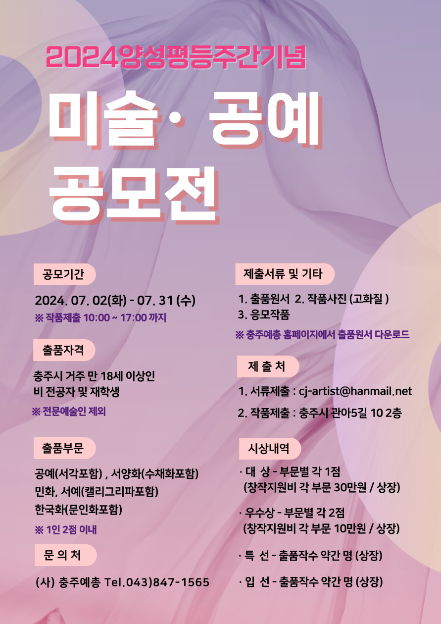 2024양성평등문화제 미술·공예공모전 개최 작성자 운영자 등록일자 2024년 7월 2일 13시 27분 39초 조회 542 ※ 자세한 공모전 요강 및 출품원서는 하단의 파일을 다운로드받아 확인해주시기 바랍니다. 2024양성평등문화제 미술공예공모전 요강.pdf [ Size : 110.11KB, Down : 676 ] 다운로드 미술공예공모전 출품원서(접수용).hwp [ Size : 106.5KB, Down : 620 ] 다운로드 웹포스터..jpg [ Size : 230.81KB, Down : 706 ] 미리보기 다운로드 목록보기