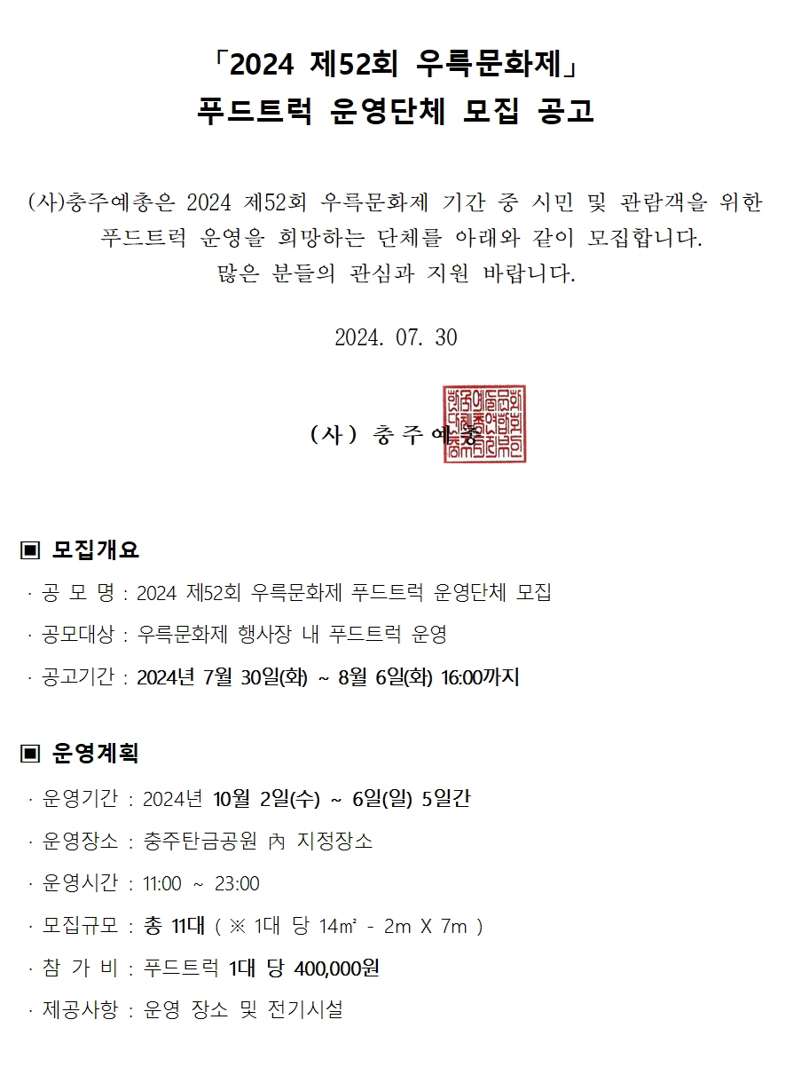 제52회 우륵문화제 푸드트럭 운영단체 모집 공고 작성자 운영자 등록일자 2024년 7월 30일 15시 58분 17초 조회 525 ※ 자세한 공고내용 및 참가신청서류는 하단의 파일을 다운로드받아 확인해주시기 바랍니다. 제52회 우륵문화제 푸드트럭 운영단체 모집 공고001.jpg [ Size : 294.65KB, Down : 661 ] 미리보기 다운로드 제52회 우륵문화제 푸드트럭 운영단체 모집 공고.pdf [ Size : 115.25KB, Down : 878 ] 다운로드 제52회 우륵문화제 푸드트럭 운영단체 참가신청서.hwp [ Size : 46KB, Down : 543 ] 다운로드 목록보기