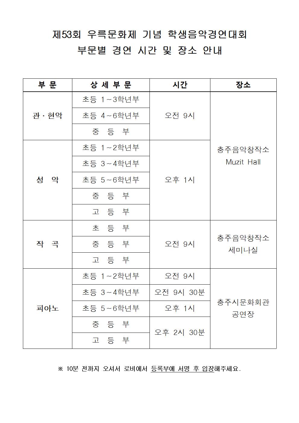제53회 전국학생음악경연대회 안내사항(경연시간 및 장소) 작성자 운영자 등록일자 2025년 7월 8일 17시 31분 10초 조회 703 ※ 자세한 대회 안내사항은 하단의 파일을 다운로드받아 확인해주시기 바랍니다. 제53회 전국학생음악경연대회 포스터.jpg [ Size : 2.95MB, Down : 297 ] 미리보기 다운로드 제53회 전국학생음악경연대회 개최요강(수정).pdf [ Size : 170.79KB, Down : 419 ] 다운로드 제53회 우륵문화제 기념 학생음악경연대회 시간 및 장소 안내001.jpg [ Size : 113.41KB, Down : 513 ] 미리보기 다운로드 제53회 우륵문화제 기념 학생음악경연대회 참가자 사전 안내(경연순서) (수정).pdf [ Size : 197.45KB, Down : 471 ] 다운로드 목록보기