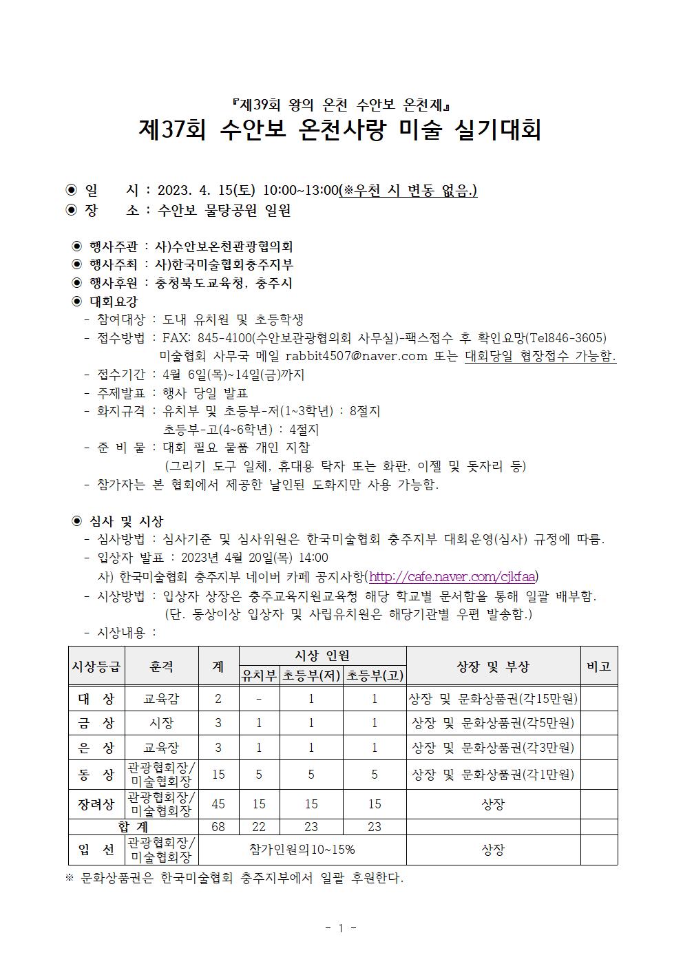 제37회 수안보 온천사랑 미술실기대회 개최 안내 작성자 운영자 등록일자 2023년 4월 3일 10시 4분 46초 조회 307 ※ 참가신청서류는 하단의 파일을 다운로드받아 확인해주시기 바랍니다. 2023.제37회 온천사랑 미술실기대회 안내.jpg [ Size : 179.63KB, Down : 348 ] 미리보기 다운로드 2023.제37회 온천사랑 미술실기대회-신청서.hwp [ Size : 64KB, Down : 620 ] 다운로드 목록보기