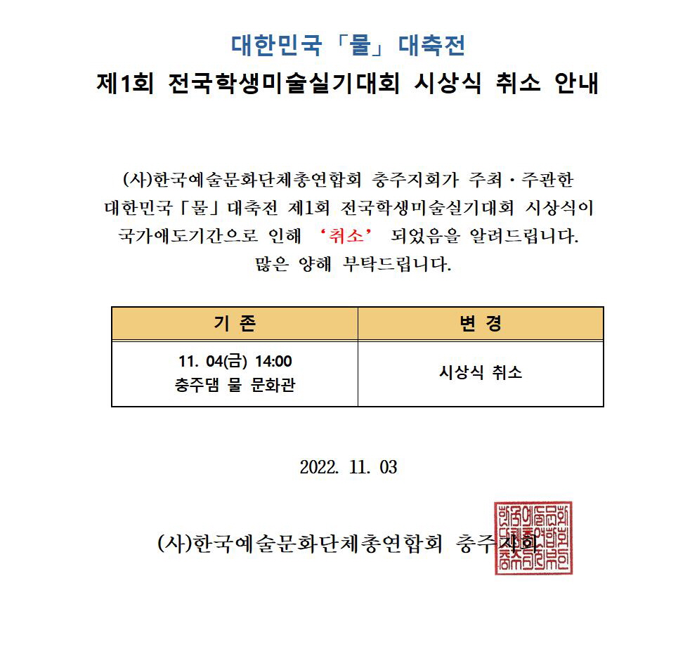 대한민국 '물' 대축전 제1회 전국학생미술실기대회 시상식 취소 안내 작성자 운영자 등록일자 2022년 11월 3일 10시 8분 4초 조회 396 시상식취소안내문.jpg [ Size : 236.57KB, Down : 488 ] 미리보기 다운로드 목록보기