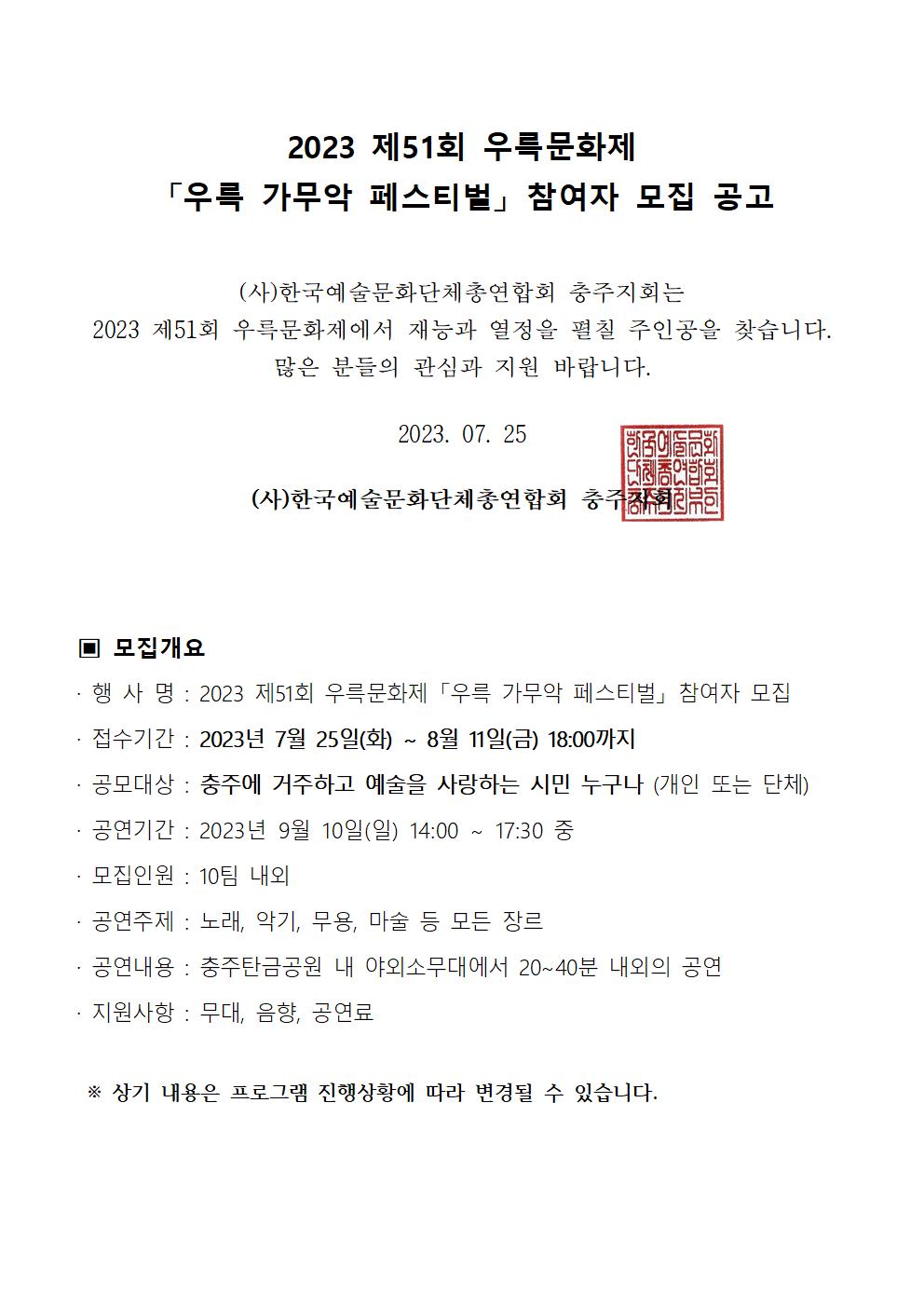 제51회 우륵문화제 '우륵 가무악 페스티벌' 참가모집 안내 작성자 운영자 등록일자 2023년 7월 25일 10시 46분 22초 조회 469 ※ 접수처 - 충주예총 공식메일 cj-artist@hanmail.net ※ 자세한 내용 및 신청 서류는 하단의 파일을 다운로드 받아 확인해주시기 바랍니다. 제51회 우륵문화제기념 우륵가무악페스티벌 공고문.pdf [ Size : 149.42KB, Down : 838 ] 다운로드 우륵가무악페스티벌 공연 참여 신청서.hwp [ Size : 39KB, Down : 612 ] 다운로드 제51회 우륵문화제기념 우륵가무악페스티벌 공고문001.jpg [ Size : 116.42KB, Down : 634 ] 미리보기 다운로드 목록보기