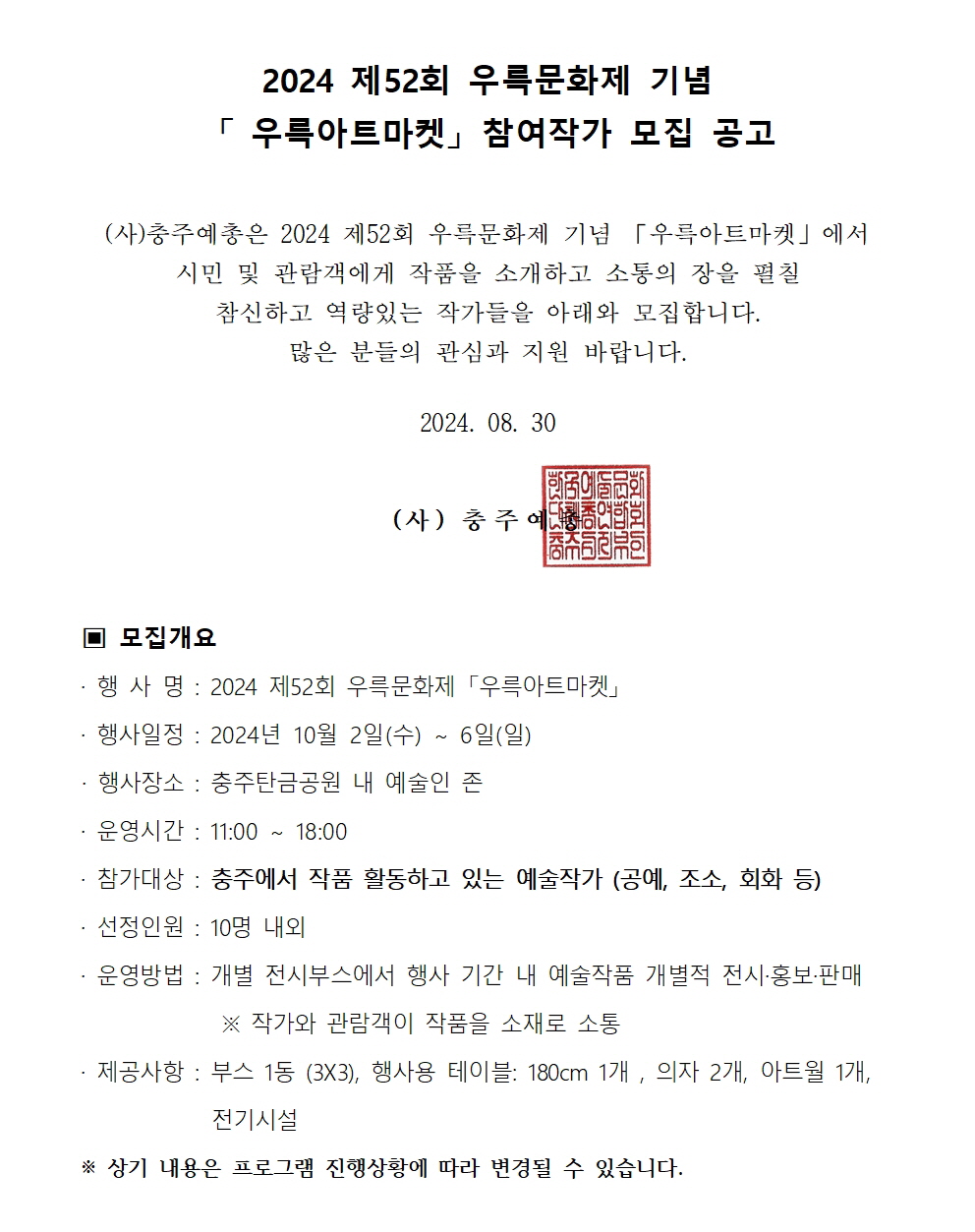 제52회 우륵문화제 기념 '우륵아트마켓' 참여작가 모집 공고 작성자 운영자 등록일자 2024년 8월 30일 17시 39분 40초 조회 461 ※ 자세한 공고내용 및 참가신청서류는 하단의 파일을 다운로드받아 확인해주시기 바랍니다. 제52회 우륵문화제 기념 우륵아트마켓 참여작가 모집 공고문.pdf [ Size : 117.43KB, Down : 658 ] 다운로드 제52회 우륵문화제 기념 우륵아트마켓 참가신청서.hwp [ Size : 44KB, Down : 511 ] 다운로드 제52회 우륵문화제 기념 우륵아트마켓 참여작가 모집 공고문001.jpg [ Size : 381.73KB, Down : 495 ] 미리보기 다운로드 목록보기