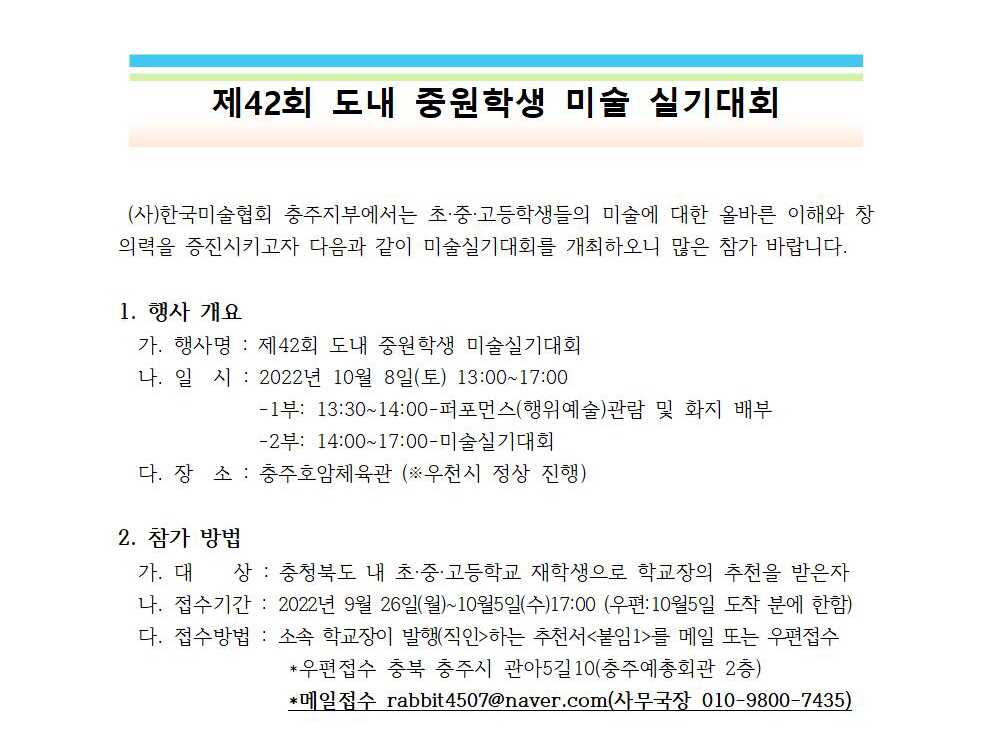 제42회 도내중원학생미술실기대회 개최 안내 작성자 운영자 등록일자 2022년 9월 6일 18시 21분 26초 조회 458 ※ 자세한 대회요강 및 신청서류는 하단의 파일을 다운로드받아 확인해주시기 바랍니다. 제42회 도내 중원학생 미술 실기대회001.jpg [ Size : 287.42KB, Down : 591 ] 미리보기 다운로드 제42회 도내 중원학생 미술 실기대회.pdf [ Size : 87.13KB, Down : 892 ] 다운로드 제42회 도내 중원학생 미술 실기대회 참가신청서.hwp [ Size : 105.5KB, Down : 646 ] 다운로드 목록보기
