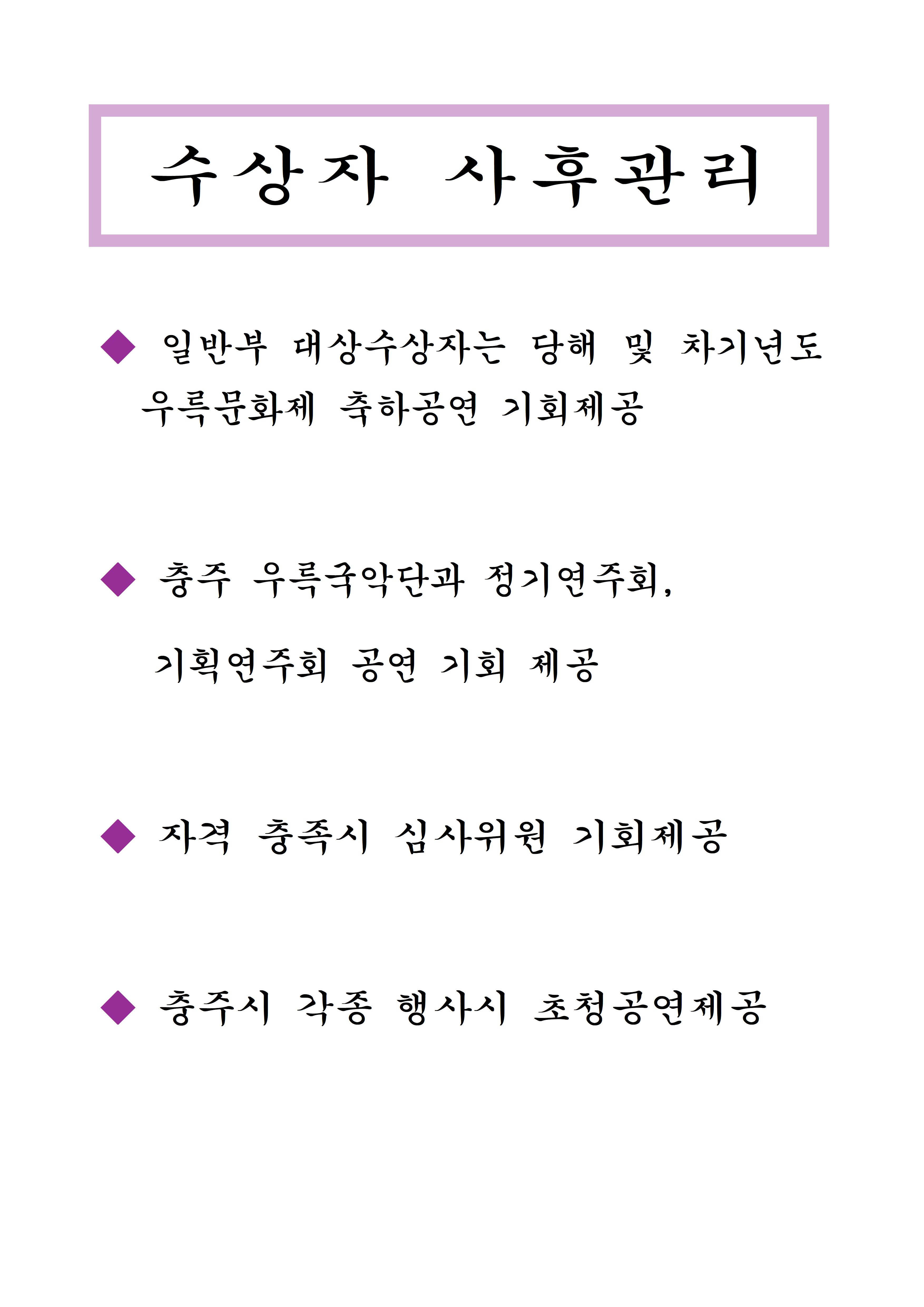 제44회 전국탄금대가야금경연대회 운영규정 및 게시사항 작성자 운영자 등록일자 2021년 8월 11일 14시 49분 10초 조회 654 제44회 전국탄금대가야금경연대회 운영규정 및 게시사항 ※ 대회 운영규정은 하단의 파일을 다운로드 받아 확인하여 주시기 바랍니다. 전국탄금대가야금경연대회 심사 운영규정(2021).pdf [ Size : 117.59KB, Down : 1,053 ] 다운로드 경연일정(게시용)001.jpg [ Size : 830.55KB, Down : 408 ] 미리보기 다운로드 심사회피제도안내문.jpg [ Size : 1.21MB, Down : 417 ] 미리보기 다운로드 수상자사후관리001.jpg [ Size : 539.05KB, Down : 355 ] 미리보기 다운로드 목록보기