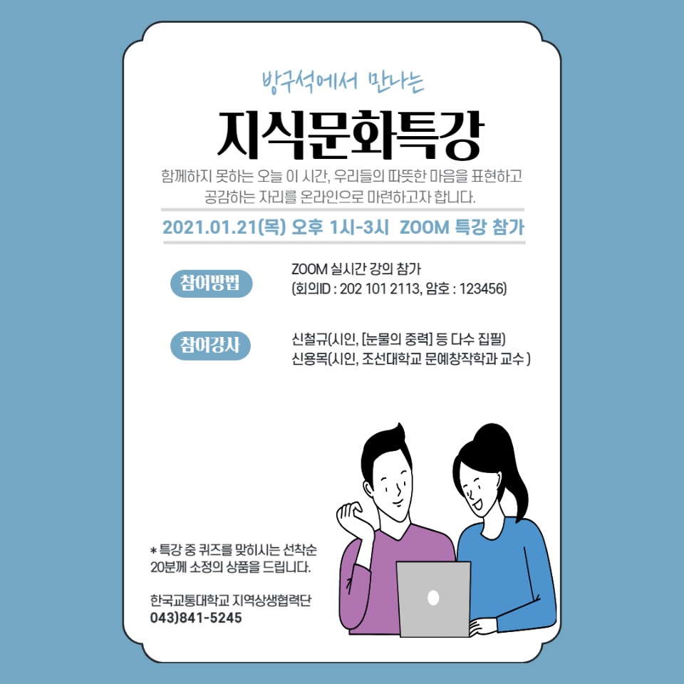 방구석에서 만나는 지식문화특강 안내 작성자 운영자 등록일자 2021년 1월 20일 15시 4분 30초 조회 828 방구석에 만나는 지식문화 특강에 관심있는 분들의 많은 참여 부탁드립니다 KakaoTalk_20210120_140504535.jpg [ Size : 132.85KB, Down : 639 ] 미리보기 다운로드 목록보기