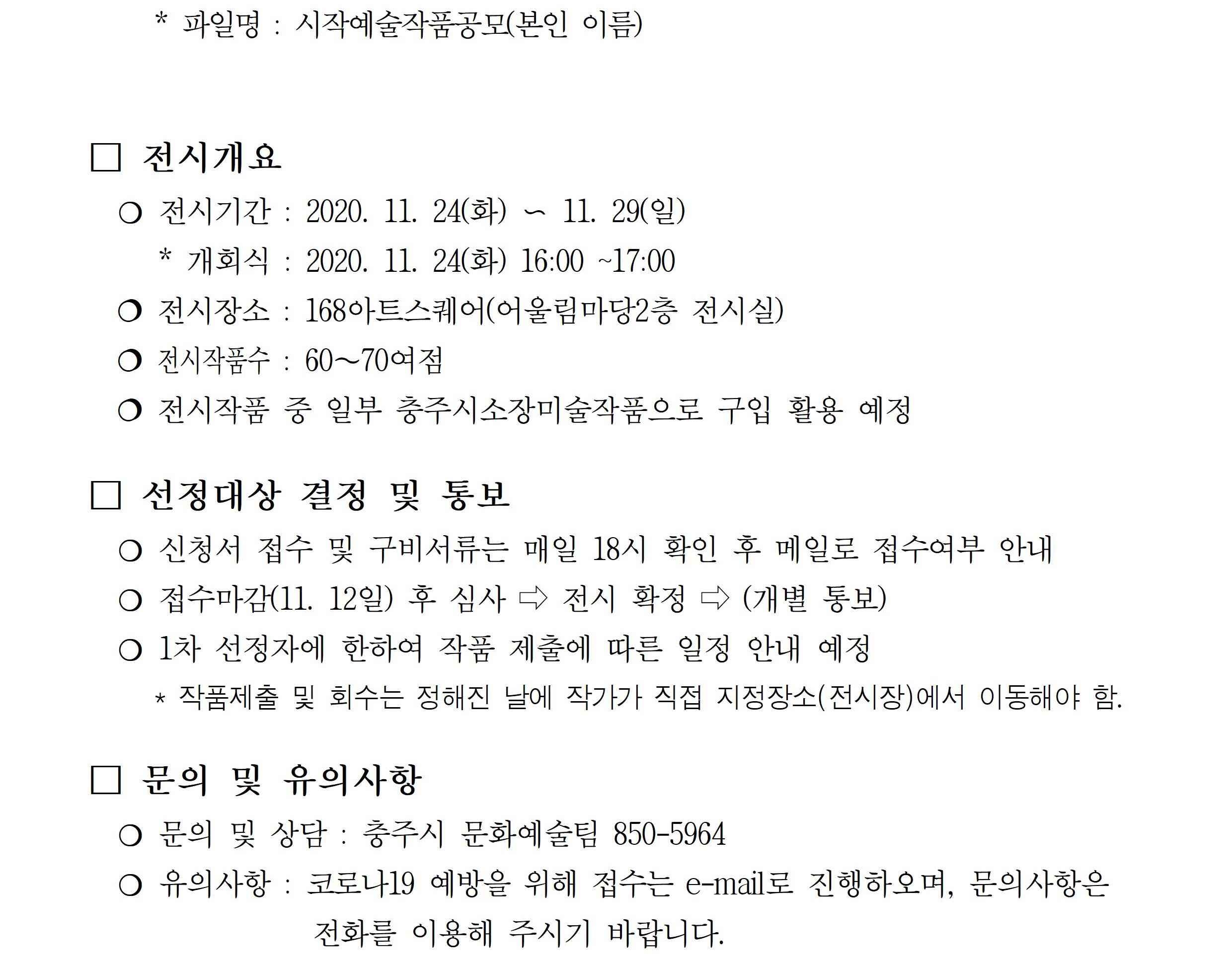 2020 시각예술작품 기획공모전 공고 작성자 운영자 등록일자 2020년 11월 6일 11시 35분 21초 조회 942 시각미술작품 기획공모전 공고문.hwp [ Size : 25.5KB, Down : 1,226 ] 다운로드 [꾸미기]충주예총시각미술작품 기획공모전 공고문001.jpg [ Size : 1.43MB, Down : 745 ] 미리보기 다운로드 [꾸미기]충주예총시각미술작품 기획공모전 공고문002.jpg [ Size : 952.65KB, Down : 713 ] 미리보기 다운로드 목록보기