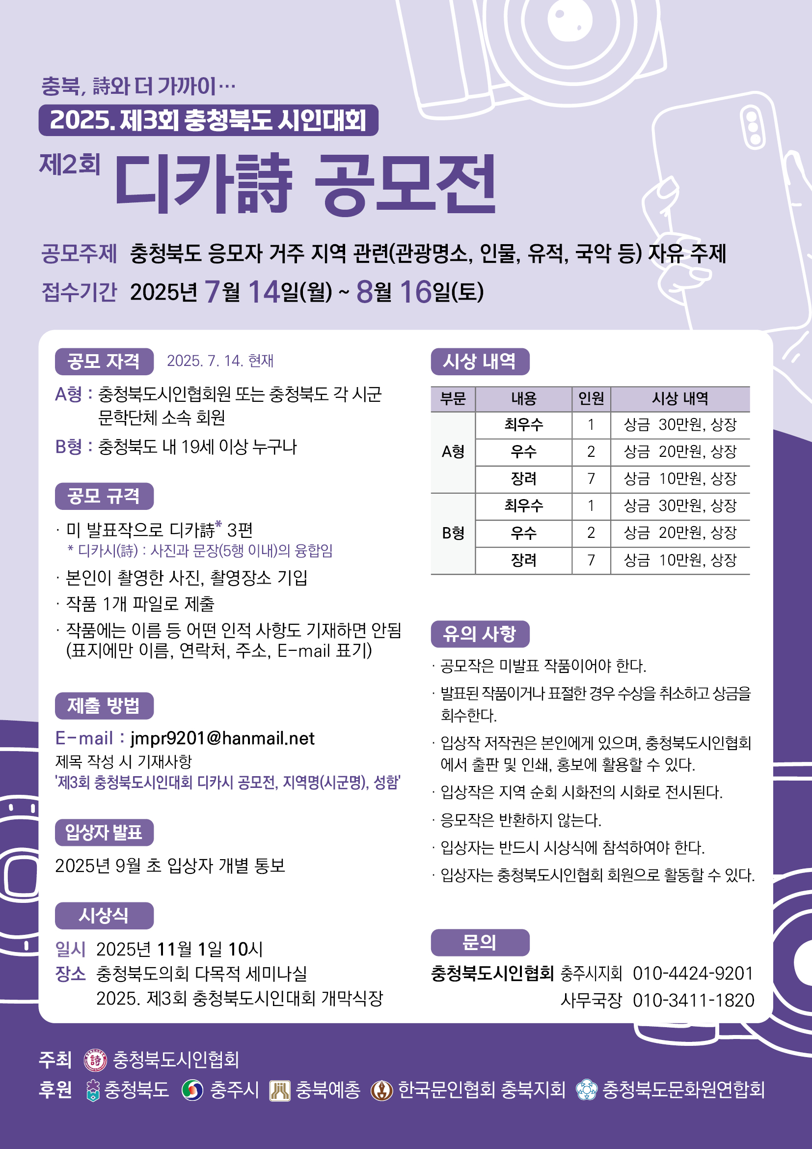 2025 제2회 디카詩 공모전 안내 작성자 운영자 등록일자 2025년 7월 14일 11시 55분 24초 조회 353 2025 제2회 디카詩 공모전에 관심있는 분들의 많은 참여 부탁드립니다. KakaoTalk_20250710_153459570.jpg [ Size : 1.09MB, Down : 105 ] 미리보기 다운로드 KakaoTalk_20250710_153459570_01.jpg [ Size : 1.05MB, Down : 106 ] 미리보기 다운로드 목록보기