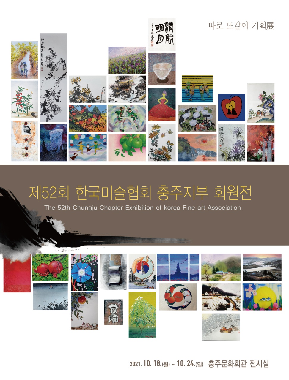 【전시】제52회 한국미술협회 충주지부 회원전 '따로 또 같이' 장소 충주시 문화회관 전시실 기간 2021년 10월 18일 ~ 2021년 10월 24일 공연시간 입장권 가격 없음 관람등급 전체연령가 문의 제52회 한국미술협회 충주지부 회원전'따로 또 같이'2021년 10월 18일(토) ~ 24일(일)충주시 문화회관 전시실 1.jpg [ Size : 357.91KB, Down : 241 ] 미리보기 다운로드 목록보기