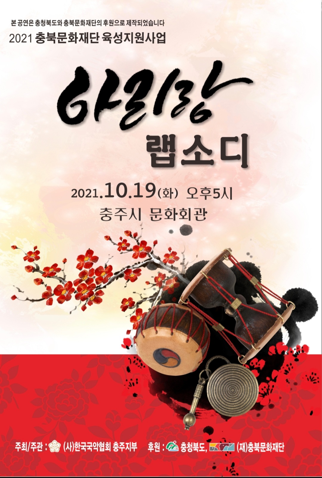 【공연】아리랑 랩소디 장소 충주시 문화회관 공연장 기간 2021년 10월 19일 ~ 2021년 10월 19일 공연시간 오후5시 입장권 가격 없음 관람등급 전체연령가 문의 2021 충북문화재단 육성지원사업'아리랑 랩소디'2021년 10월 19일(화) 오후5시 충주시 문화회관 1.jpg [ Size : 365.03KB, Down : 183 ] 미리보기 다운로드 목록보기