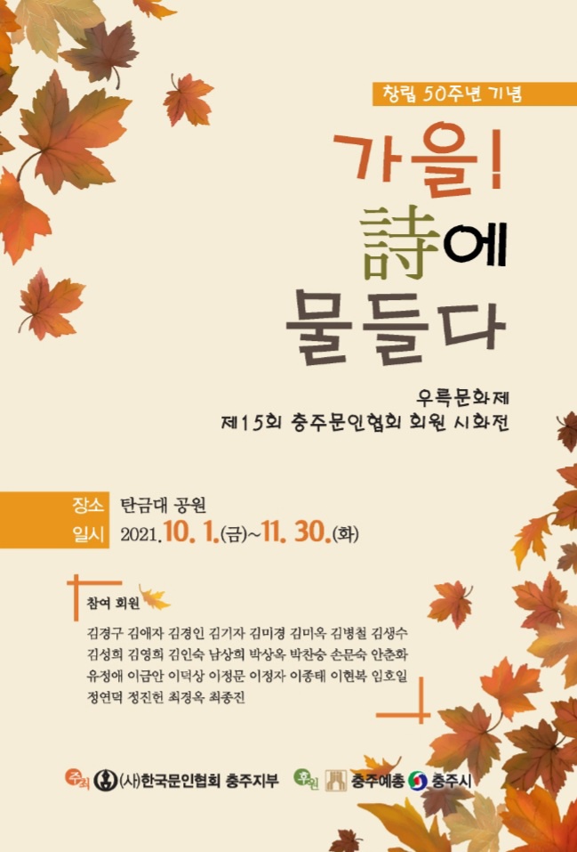 【전시】한국문인협회 충주지부 회원 시화전 ' 가을! 시에 물들다' 장소 탄금대 공원 기간 2021년 10월 1일 ~ 2021년 11월 30일 공연시간 입장권 가격 없음 관람등급 전체연령가 문의 한국문인협회 충주지부 회원 시화전' 가을! 시에 물들다'2021년 10월 1일(금)~11월30일(화)탄금대 공원 (야외전시) 1.jpg [ Size : 110.59KB, Down : 297 ] 미리보기 다운로드 목록보기