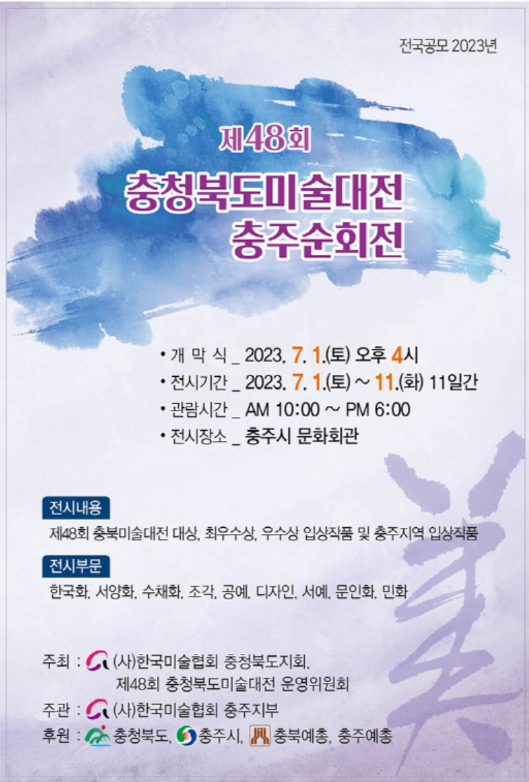 【전시】제48회 충청북도미술대전 충주순회전 장소 충주시문화회관 전시실 기간 2023년 7월 1일 ~ 2023년 7월 11일 공연시간 10:00~18:00 입장권 가격 관람등급 문의 제48회 충청북도미술대전 충주순회전일시 2023년 7월 1일(토) ~ 7월 11일(화) 11일간장소 충주시 문화회관 전시실개막식 2023년 7월 1일(토) 오후4시 충주순회전.jpg [ Size : 166.11KB, Down : 266 ] 미리보기 다운로드 목록보기