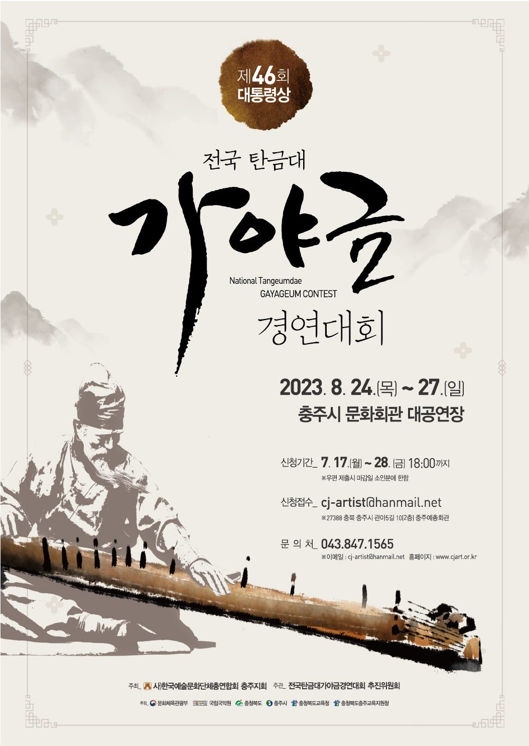 【행사】제46회 대통령상 전국탄금대가야금경연대회 장소 충주시 문화회관 대공연장 기간 2023년 8월 24일 ~ 2023년 8월 27일 공연시간 09:30 ~ 18:00 입장권 가격 관람등급 문의 제46회 대통령상 전국탄금대가야금경연대회 제46회전국탄금대가야금경연대회포스터(최종).jpg [ Size : 178.73KB, Down : 285 ] 미리보기 다운로드 목록보기